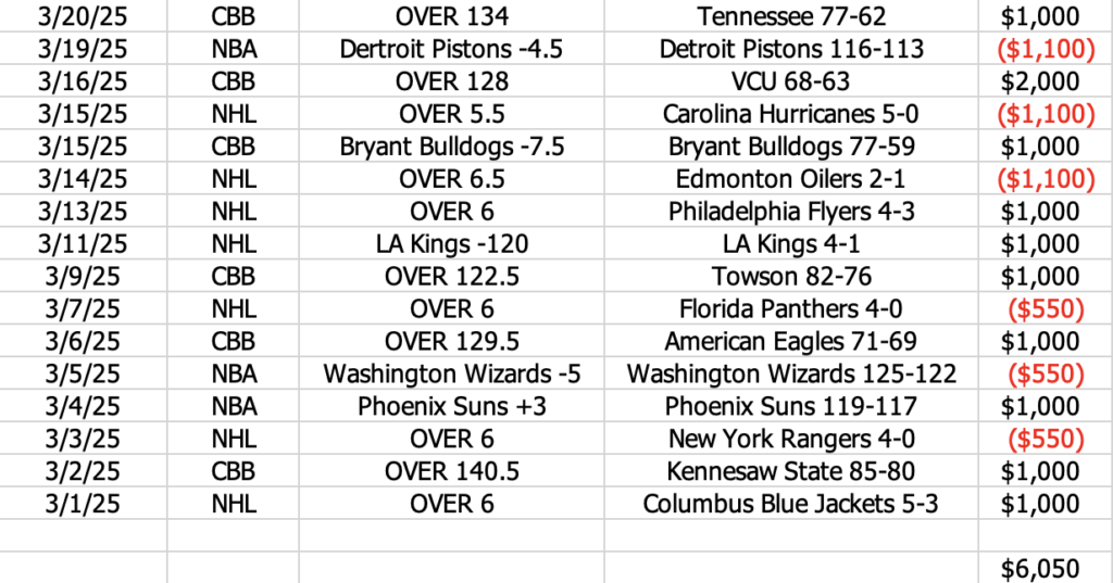 March 2025 Sports Betting Results to Date -> 10-6 (60%) +$6,050