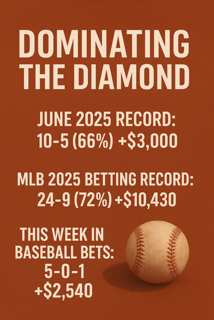 Baseball betting is all about momentum—and June has delivered. I kicked off the month strong, targeting undervalued spots and avoiding the heavy chalk. The result is a 10-5 record (+$3,000) that’s put subscribers in a great position heading into the summer stretch.