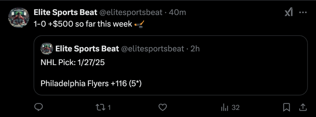 It was an easy win last night a expected as I backed the Philadelphia Flyers +116 as a 5* pick (proof here). So far this NHL season here at Elite Sports Beat I am 8-3 (72%) $3,440 overall! While being 1-0 +$500 so far this week in picks. And this is going to be a BUSY week full of NHL picks. So I highly suggest you listen up and take full advantage of today’s BIG offer!